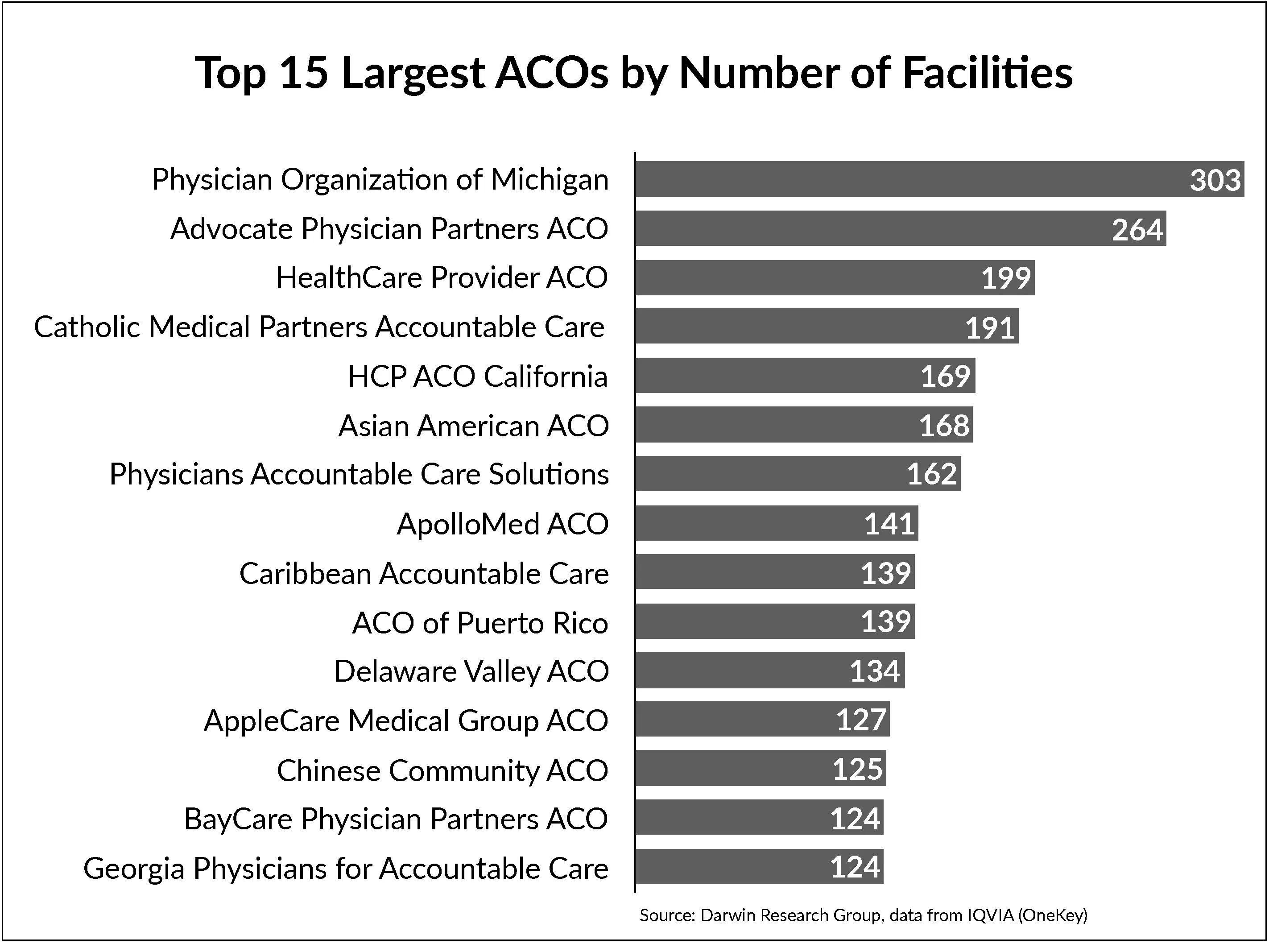 IQVIA recently released a report on the nations largest ACOs by the number of facilities, including hospitals, medical groups, nursing homes and other facilities. Four of the largest are in New York, including Healthcare Provider ACO, Catholic Medical Partners, Asian American ACO, and Chinese Community ACO. Two of the top 15 are in Puerto Rico. Click on the chart to download.